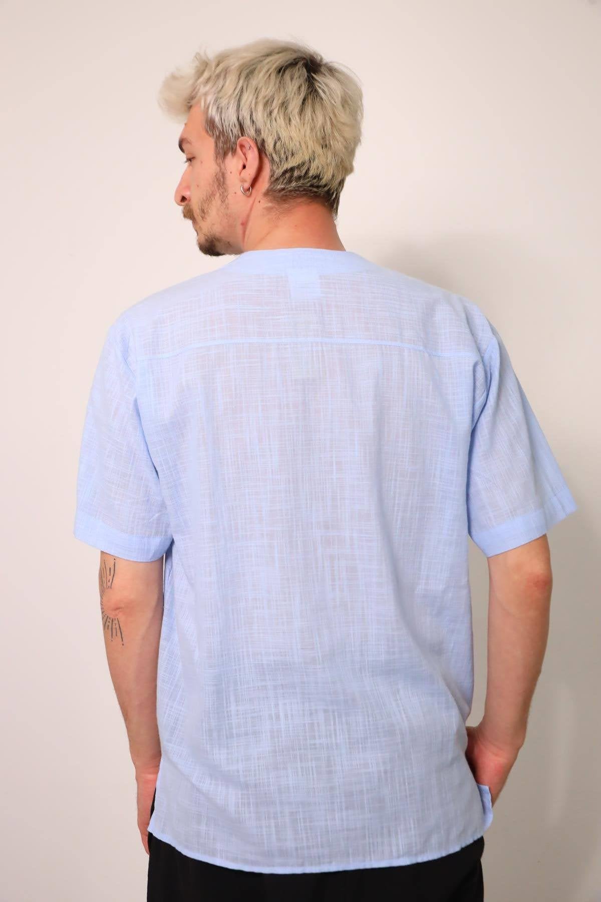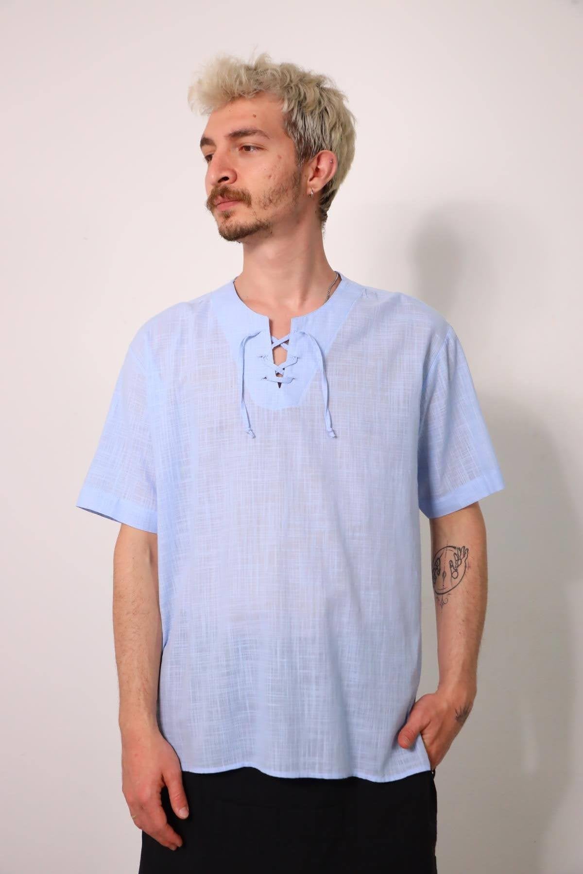 Blue Lace-Up Collar Slit Short Sleeve Men's Shirt