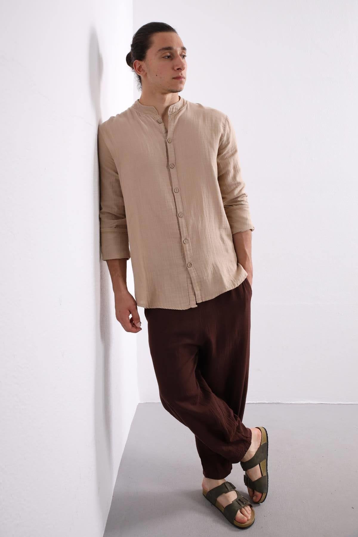 Camel-colored Mandarin Collar Cotton Shirt