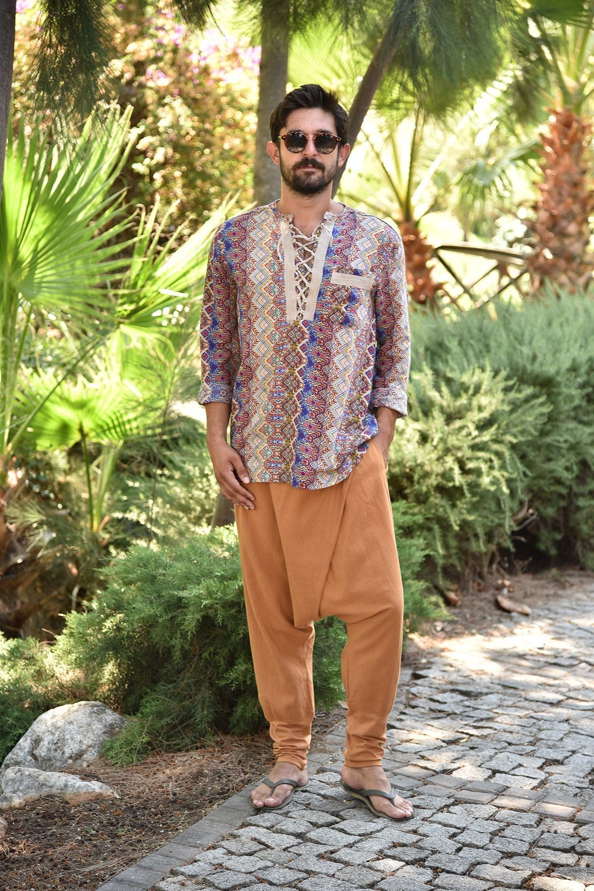 Grey Patterned Bohemian Men's Shirt with Lace-Up Collar