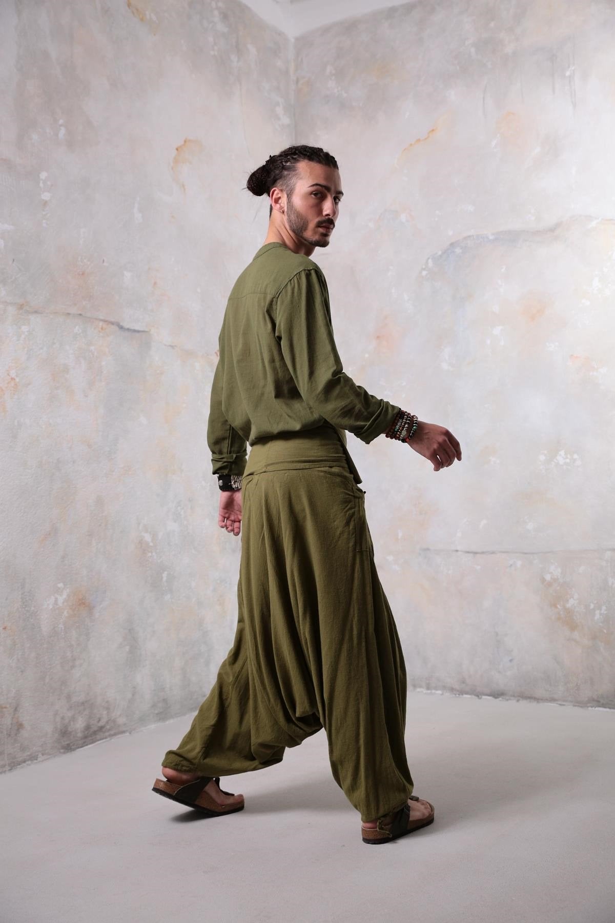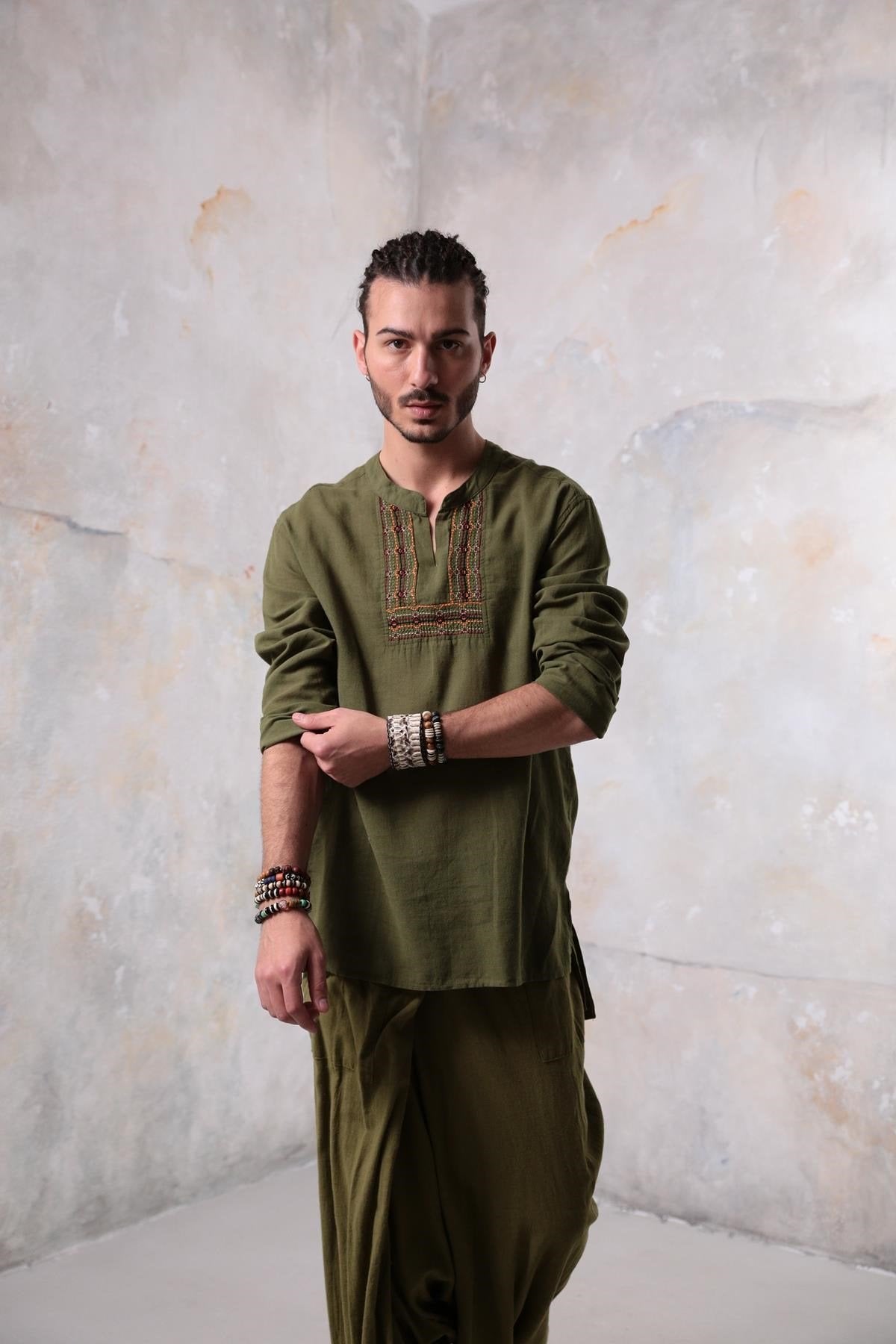 Khaki Mandarin Collar Men's Shirt with Embroidered Detail