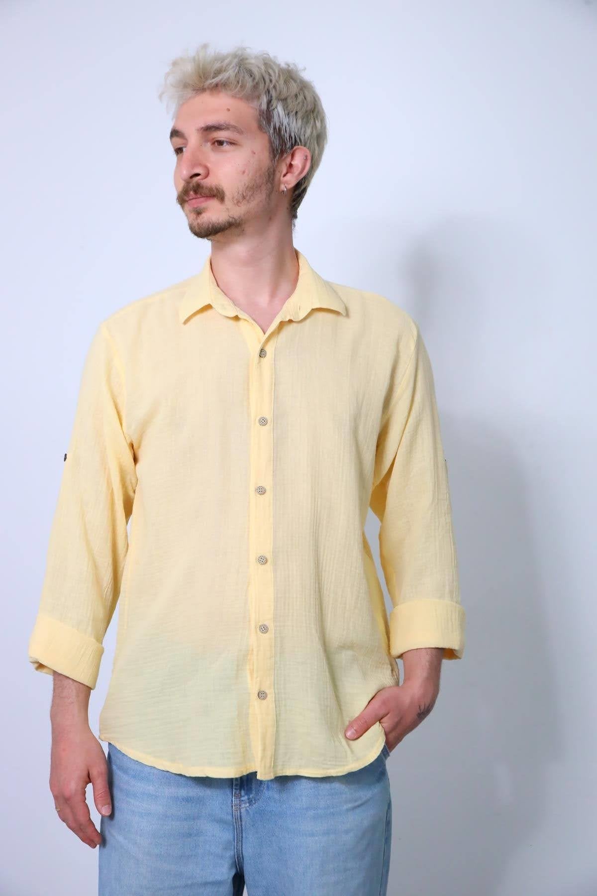 Lemon Yellow Men's Muslin Shirt with Epauletted Sleeves