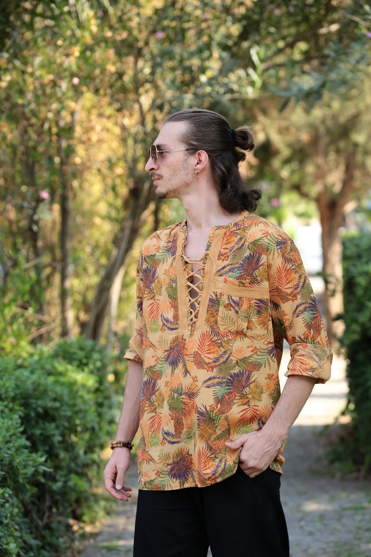 Mustard Patterned Bohemian Men's Shirt with Lace-Up Collar
