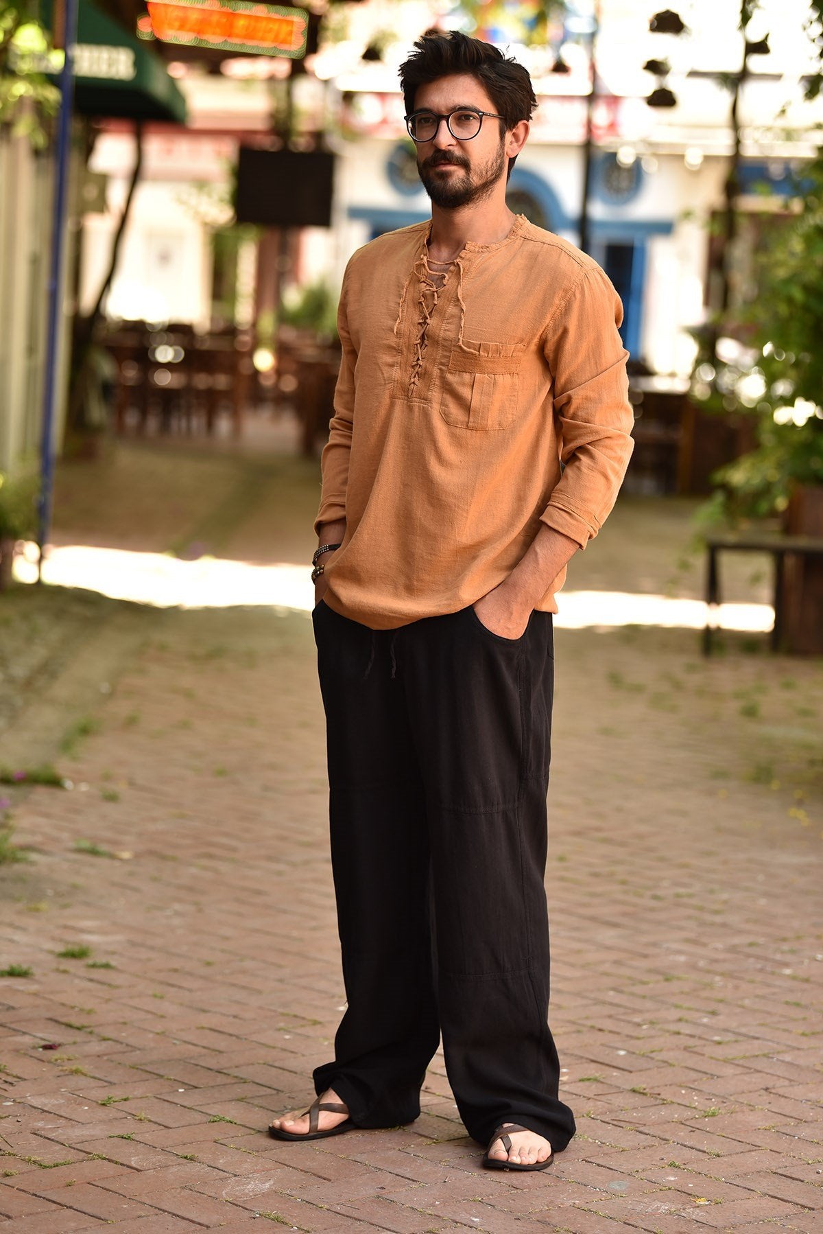 Relaxed Fit Bohemian Shirt with Lace-Up Collar