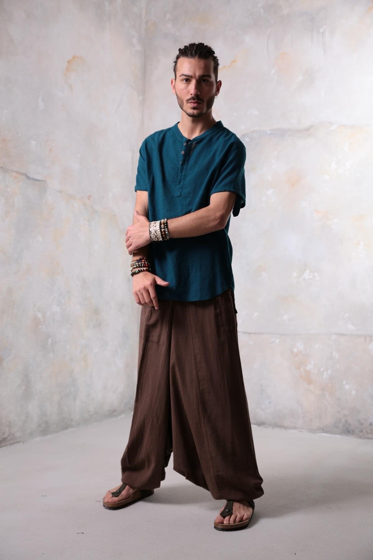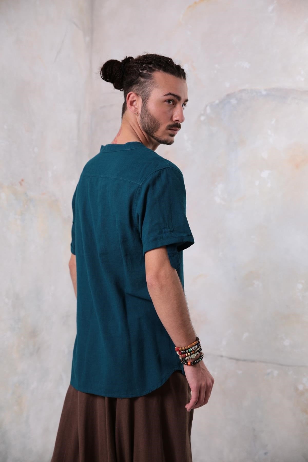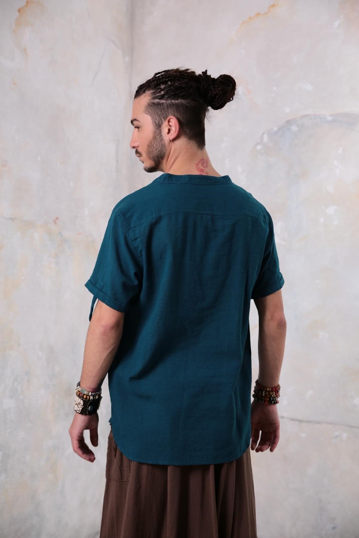 Petrol Blue Buttoned Short-Sleeved Mandarin Collar Men's Shirt