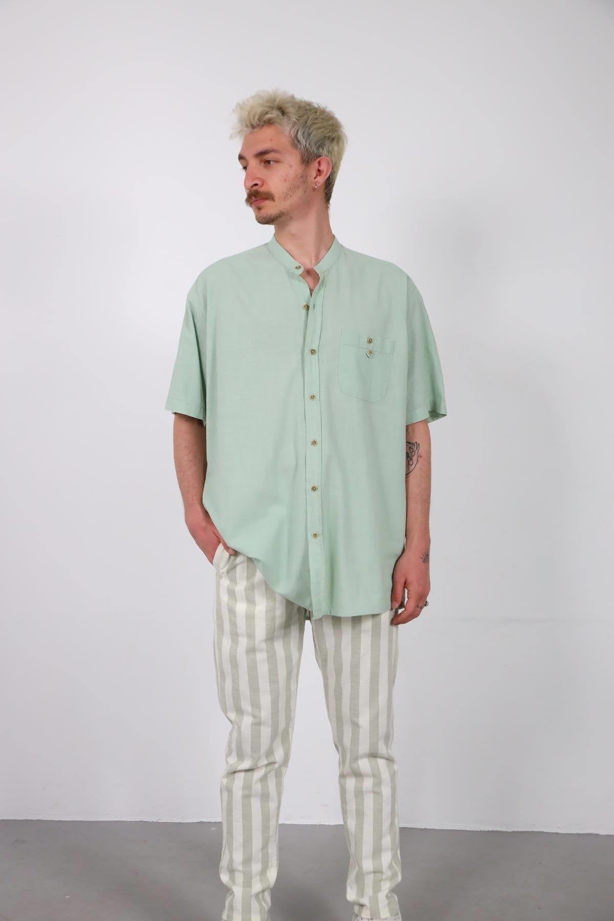 Sea Green Mandarin Collar Pocket Detailed Short Sleeve Men's Shirt