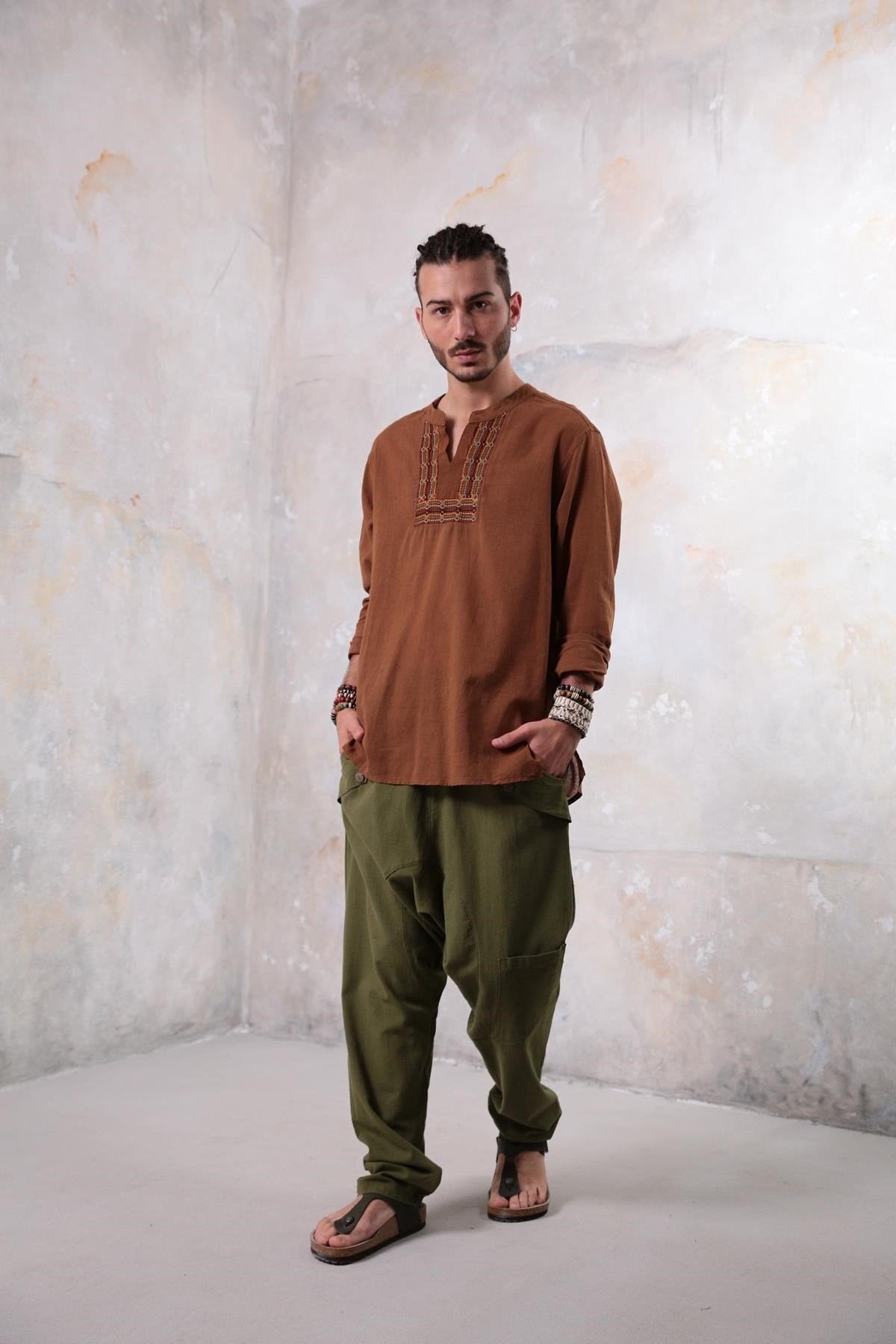 Tan Mandarin Collar Embroidered Detailed Men's Shirt