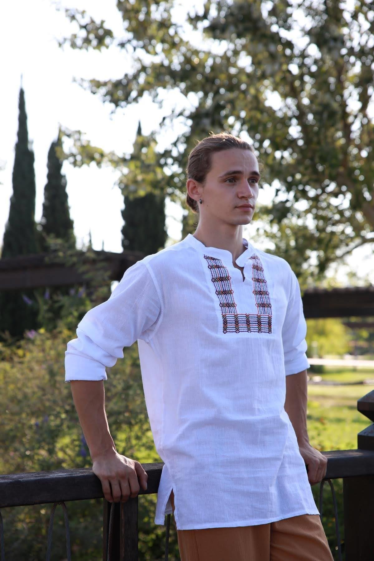 White Mandarin Collar Cotton Shirt with Embroidered Detail